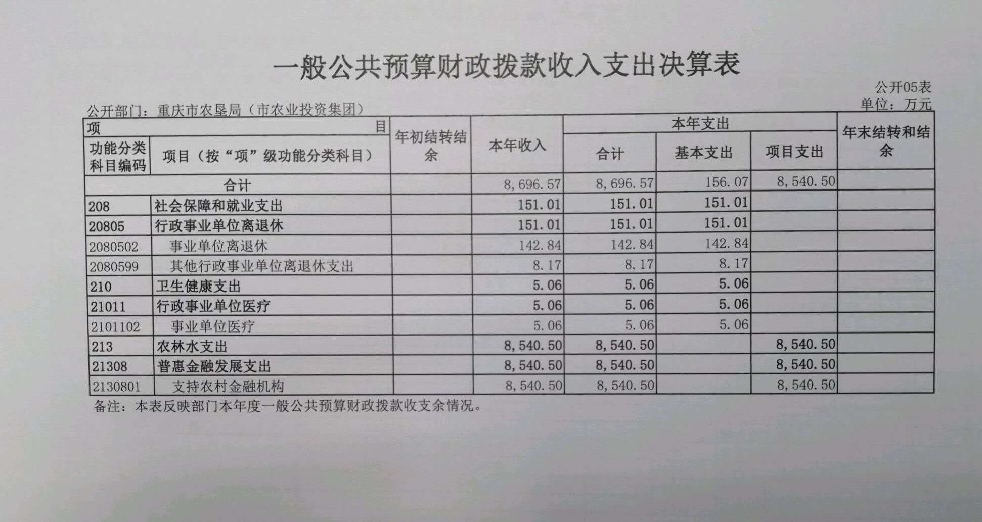 2019年財(cái)政撥款收入8696.57萬元,其中:人員經(jīng)費(fèi)156.07萬元,農(nóng)墾產(chǎn)業(yè)基金(一般項(xiàng)目)8540.5萬元;財(cái)政撥款支出8696.57萬元,其中:支付代管原重慶市種公牛站的離退休人員離退休費(fèi)用156.07萬元,注資農(nóng)墾產(chǎn)業(yè)基金8540.5萬元。年末無結(jié)余和結(jié)轉(zhuǎn)資金。